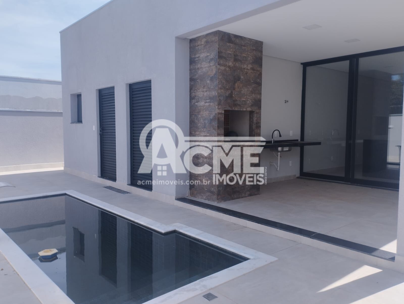 Espaço gourmet com churrasqueira junto a piscina e quintal