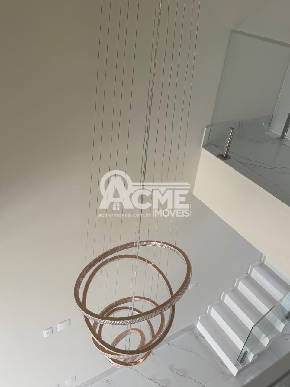 - Pendente de LED com cinco anéis dourados no living